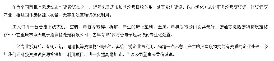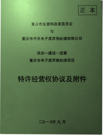 從2010年開始,公司就是重慶市政府公開招投標確定的重慶市電子廢棄物處理特許經(jīng)營權企業(yè),在重慶市“一小時經(jīng)濟圈”范圍內(nèi)23個區(qū)縣,開展電子廢棄物綜合回收機處理處置業(yè)務。